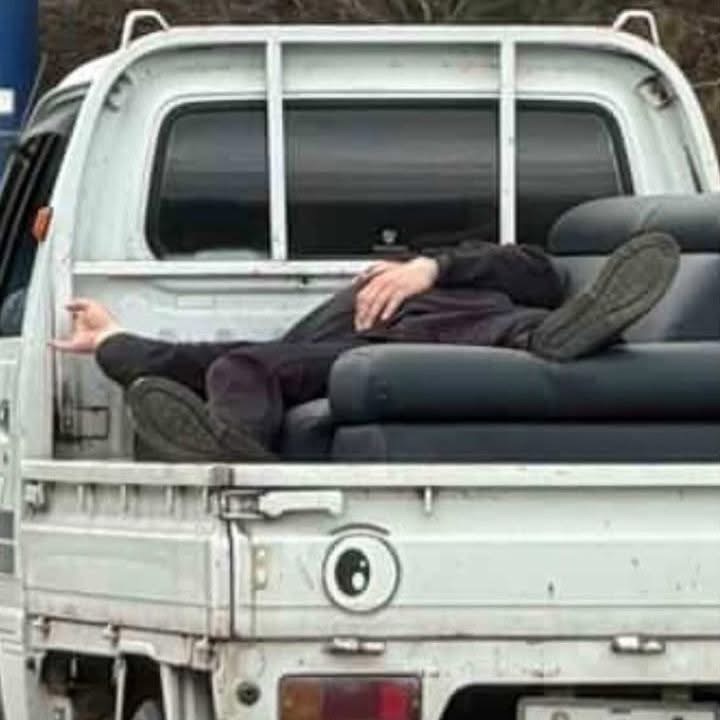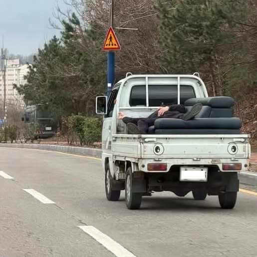 충북 홍성 도로 위 목격했습니다. 적재함에 소파에 남성이 누워 있어 떨어지지 않게 조심하시길