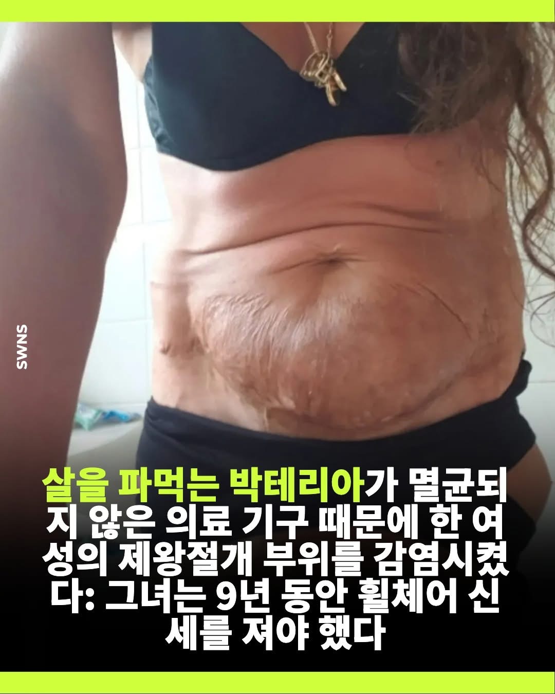 수술 후 2주가 지나자 그녀의 체온은 급격히 상승했고, 상처에서는 고름이 통제 불가능하게 흘러나오기 시작했습니다. 병원 의사들은 피부의 깊은 조직을 엄청난 속도로 파괴하는 살을 파먹는 감염, 괴사성 근막염으로 진단했습니다.