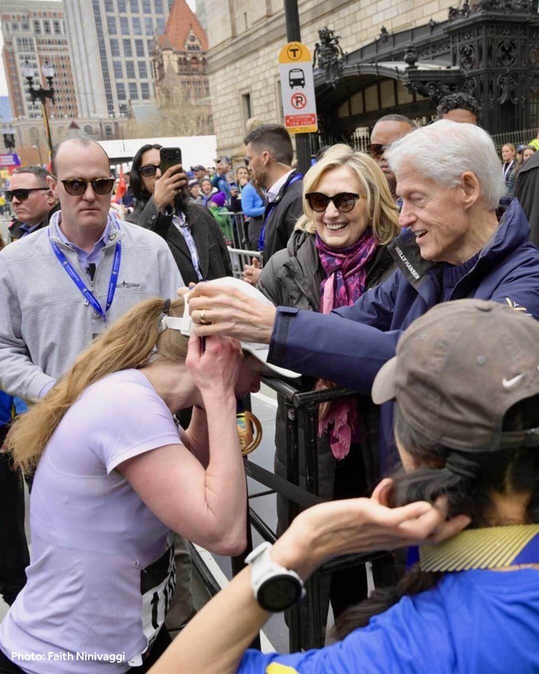 CONGRATS, CHELSEA! Chelsea Clinton hugs her parents, Bill and Hillary Clinton, after crossing the finish line at the 130th Boston Marathon.