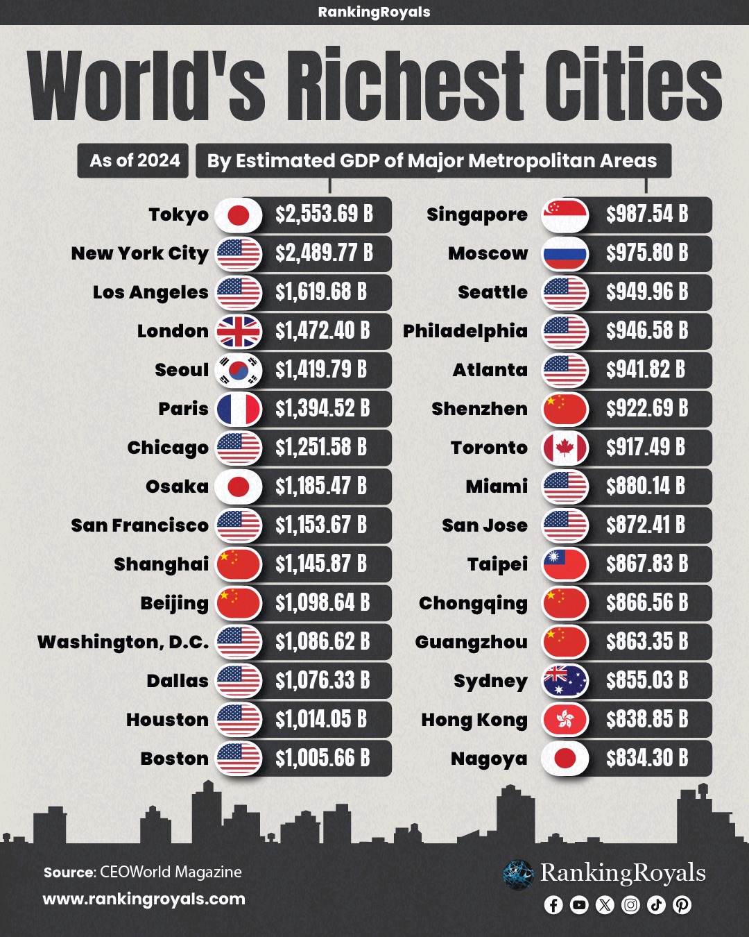 도쿄와 뉴욕은 세계에서 가장 부유한 두 도시로 널리 평가되며, 2024~2025년 기준 도시권 총생산(GMP) 기준으로 도쿄가 보통 1위, 뉴욕 대도시권이 2위를 차지한다.
